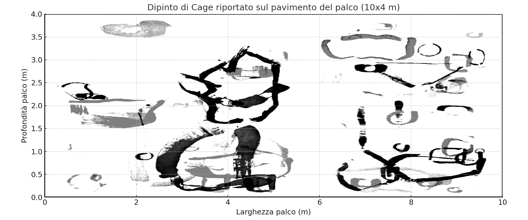 ENG: The stage movement will follow the scheme of Cage’s painting that inspired this work, projected on the stage floor, in reference to Cage’s 1958 piece “Music Walk” (“Passeggiata Musicale”).